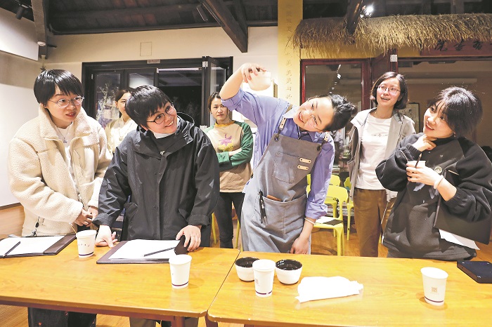 3月31日晚,在南京市玄武区小红梅信仰生活空间,“辛苦咖”夜校专场活动正在进行。班主任小辛(右三)带领大家“喝门道”,对咖啡风味进行品饮、识别和探索。