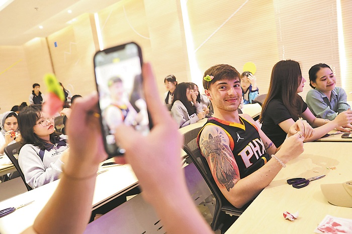 3月30日晚,在南京市鼓楼区的一堂非遗绒花课上,一位来自波兰的留学生将自己做的绒花簪子戴在头上。