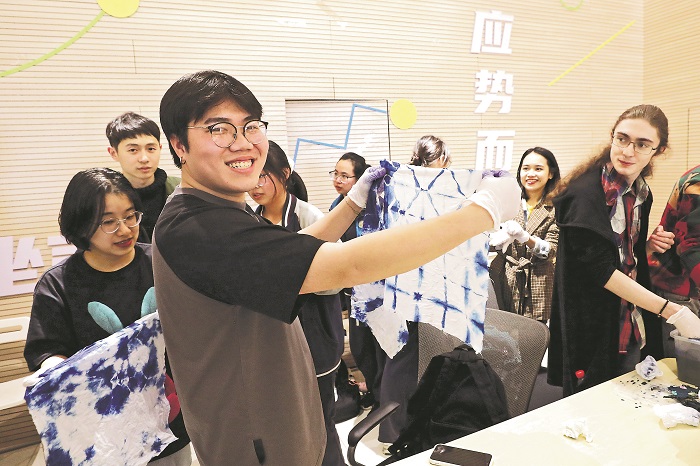 3月29日晚,在南京市鼓楼区的一堂扎染课上,一位来自越南的南京大学留学生展示自己的扎染作品。