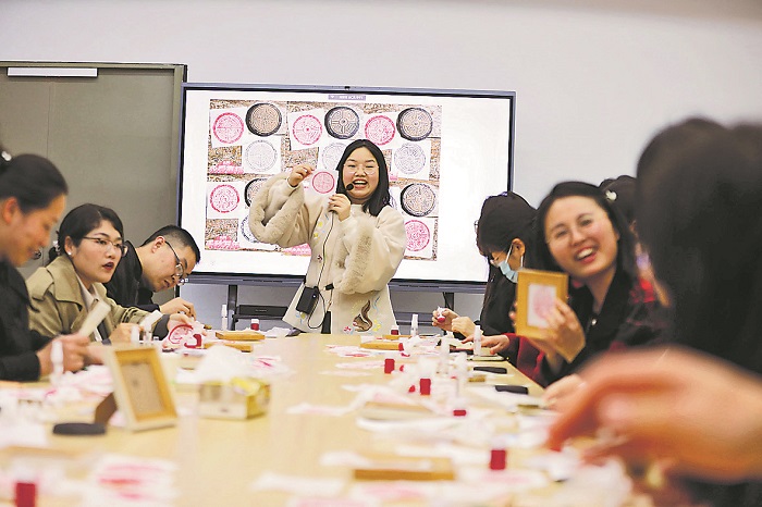 3月28日晚,南京江北新区绿水湾社区非遗拓印课程。