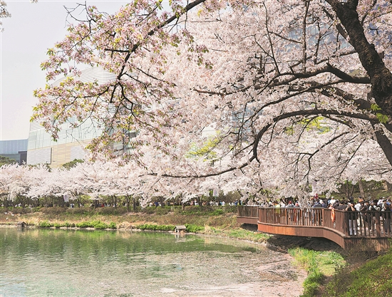 当地时间4月7日,游人在韩国首尔石村湖附近欣赏樱花。近日,韩国首尔天气转暖,樱花陆续开放。 新华社记者 姚琪琳 摄