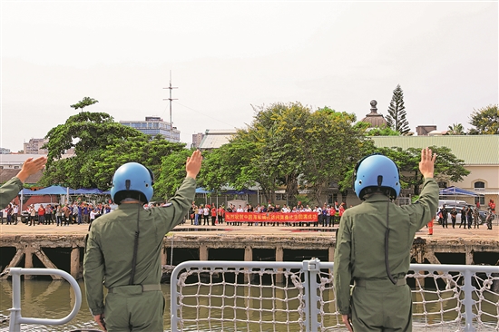 近日,中国海军第45批护航编队离开莫桑比克马普托港,官兵向欢送人群挥手致意。新华社发 (王远方 摄)