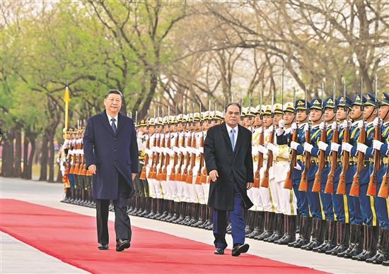 4月9日下午,国家主席习近平在北京人民大会堂同来华进行国事访问的密克罗尼西亚联邦总统西米纳举行会谈。这是会谈前,习近平在人民大会堂东门外广场为西米纳举行欢迎仪式。新华社记者 岳月伟 摄
