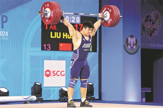 3月31日至4月11日,2024年国际举重联合会世界杯在泰国普吉岛举行。在男子102公斤级比赛中,中国选手刘焕华以挺举232公斤、总成绩413公斤打破该项目挺举和总成绩世界纪录并获得冠军。图为刘焕华在比赛中。新华社记者 王腾 摄