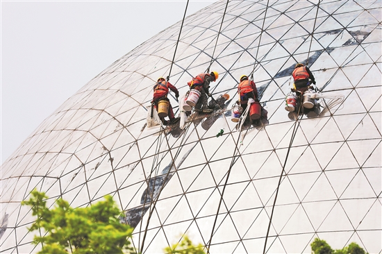 4月4日,北京的一处圆形建筑上,“蜘蛛人”正在外立面作业。在高楼耸立的大都市,有一群人,手持各式工具在数十米高的建筑外立面施工作业,他们中有清洁工、维修工、建筑工等,被形象地称为城市里的“蜘蛛人”。近年来,各类玻璃幕墙广泛应用于建筑外立面,这些“蜘蛛人”队伍也日益多了起来,他们的分工也越发明细。清洁、维修、更换广告牌、玻璃安装……他们在用双手创造自己幸福生活的同时,也装扮着城市容颜。本报记者 王伟伟 摄