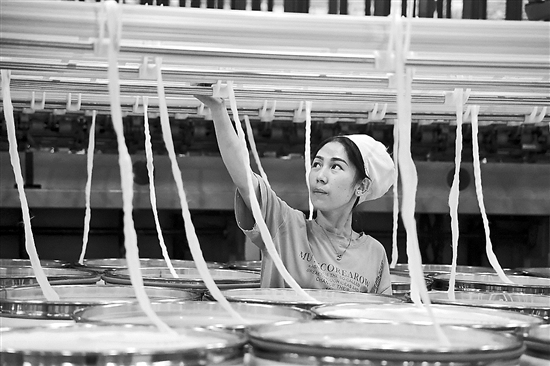 4月7日,纺织工人正在新疆维吾尔自治区阿克苏地区乌什县华盛纺织有限公司生产车间作业。据了解,该公司是乌什县重点招商引资项目,年产值达4亿元,带动当地600人就业。近年来,乌什县通过建设产业园区、引进大型纺织企业等措施,大力发展纺织产业,带动群众在家门口就业增收。