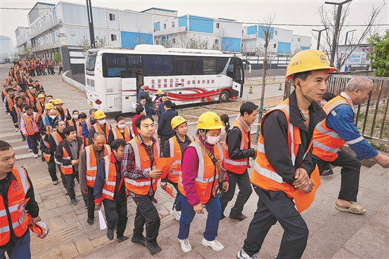 4月12日,在北京城市副中心综合交通枢纽建设项目,工人们正在排队进行免费体检。此次免费公益健康体检主要针对此建设项目的特种行业职工和女职工,共有6家参建单位的900多名职工参加了体检。本报记者 吴凡 摄