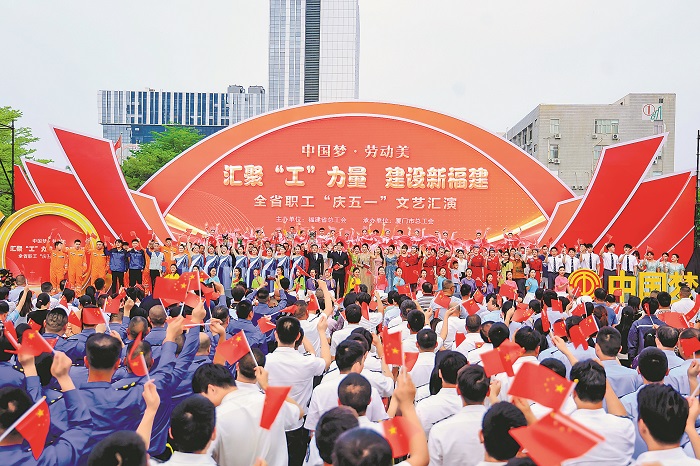 4月13日,福建省厦门市五一广场上,潮声与乐声相伴,歌声与掌声相随。由福建省总工会主办、厦门市总工会承办的“中国梦·劳动美——汇聚‘工’力量 建设新福建”全省职工“庆五一”文艺汇演在此举行,吸引了不少劳模和职工来广场打卡、观演,邂逅劳动的“音符”、体验别样的“相聚”。