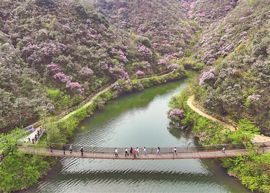 4月14日,游客在湖南省永州市双牌县阳明山国家森林公园万和湖景区赏花游玩(无人机照片)。