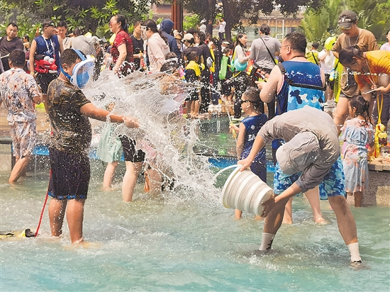 当日,云南省西双版纳傣族自治州举行泼水狂欢活动,人们欢聚在景洪市泼水广场,用相互泼水的方式互送祝福,庆祝泼水节。新华社记者 董博怀 摄