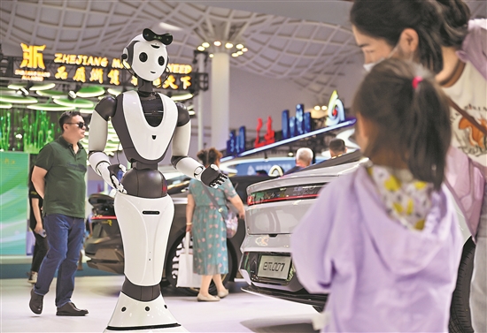 4月15日,第四届消博会湖北展馆的一台AI人形智能服务机器人在与观众进行互动。