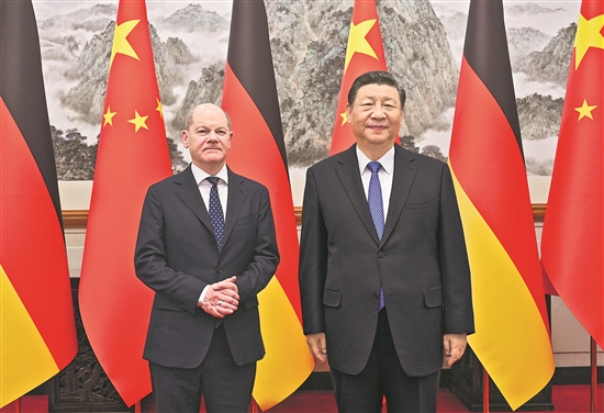 习近平指出,中德产业链供应链深度互嵌,两国市场高度依存。中德互利合作不是“风险”,而是双方关系稳定的保障、开创未来的机遇。无论是机械制造、汽车等传统领域,还是绿色转型、数字化、人工智能等新兴领域,两国都有合作共赢的巨大潜力亟待挖掘。双方应该发扬互利共赢的鲜明特色,彼此成就。中国出口电动汽车、锂电池、光伏产品等,不仅丰富了全球供给,缓解了全球通胀压力,也为全球应对气候变化和绿色低碳转型作出巨大贡献。中德两国都是以实业立国,都支持自由贸易和经济全球化。双方要警惕保护主义抬头,坚持以市场眼光和全球视野,从经济规律出发,客观、辩证看待产能问题,多探讨合作。中国坚持对外开放基本国策,希望德方为中国企业赴德发展提供公平、透明、开放、非歧视的营商环境。中德在世界多极化问题上有不少共通之处。多极化本质上应该是不同文明、不同制度、不同道路的国家之间相互尊重、和平共处。中德应该独立自主开展多边领域协作,推动国际社会用实际行动更好应对气候变化、发展不平衡、地区冲突等全球性挑战,为世界的平衡稳定作出更多贡献。