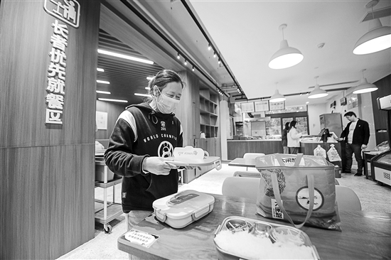 近年来,浙江宁波市江北区以破解老年人“吃饭难”为突破口,打造“老年食堂+共享餐厅+助餐点”的“15分钟”助餐服务圈,给老年人群体提供更好的助餐服务。目前,宁波市江北区共建成标准化老年食堂19个、共享餐厅13家。图为 4月12日,大闸社区社工在共享食堂内打包午饭准备为老年人送餐。新华社记者 江汉 摄