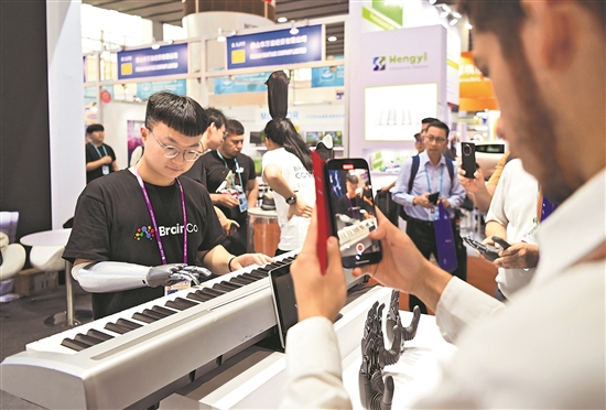 4月17日,佩戴智能仿生手的参展商工作人员在强脑科技展台演奏电子琴。