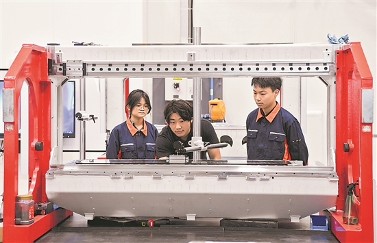 4月16日,在埃斯维(重庆)机床有限公司,工作人员(中)为重庆城市职业学院中德产业学院学生演示设备操作。近年来,重庆城市职业学院引入德国职业教育的先进经验,推动校企合作、产教融合,着力培养高素质技能人才。新华社记者 王全超 摄