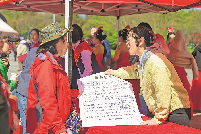 4月17日,“筑梦李沧养老 护佑银发安康”养老服务人才专场招聘会暨养老服务大集在山东省青岛市李沧文化公园广场举办。招聘会现场,10家养老机构提供养老护理员、医护、院长助理等各类就业岗位需求百余个,吸引众多求职者前来咨询应聘。近年来,李沧区大力开展养老护理职业技能培训,不断培养养老服务人才。本报通讯员 张鹰 摄