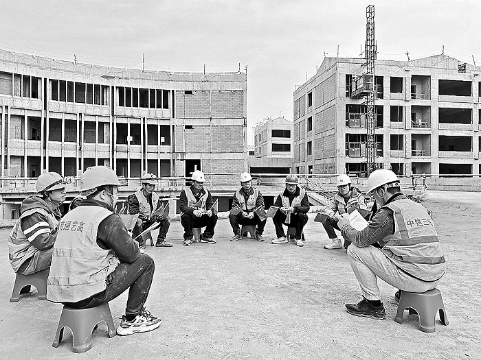 日前,一支“小板凳”宣讲队来到河南省试验中学建设项目现场。在亲手盖起的建筑楼顶,工友们围坐在一张张小板凳上,认真听志愿者宣讲新时代产业工人知识,时而蹙额思考,时而点头表示赞同。