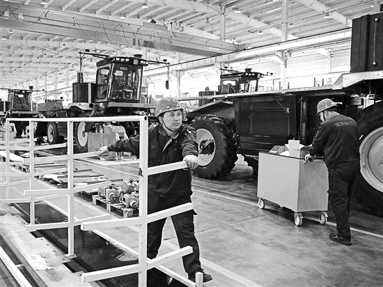 4月16日,新疆塔城地区乌苏市钵施然智能农机股份有限公司的采棉机生产车间进入生产高峰,工人加紧转运所需零件,为秋季棉花采收做好准备。新华社记者 张啸诚 摄