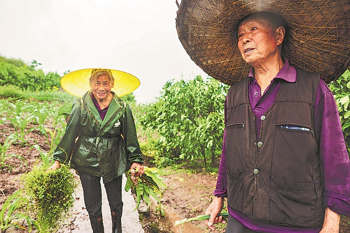 4月16日,重庆市渝北区石船镇黄岭村,村民周庆兰(图左)与老伴罗光华在雨中摘菜。