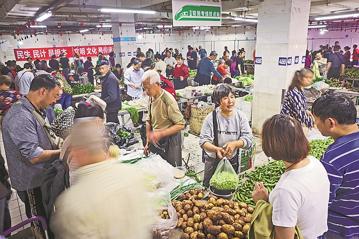 4月14日,重庆市江北区新民乐安心菜场,乘坐“背篓专线”前来的菜农在售卖当天的蔬菜。