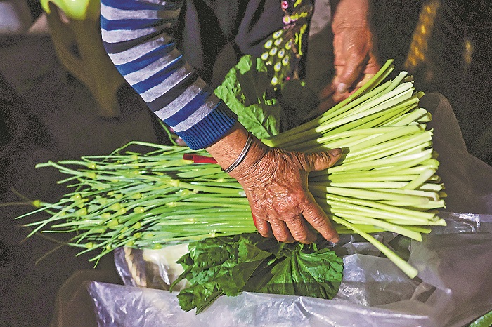 4月17日凌晨,重庆市渝北区石船镇黄岭村,周庆兰在整理背篓里的蔬菜,准备出门。