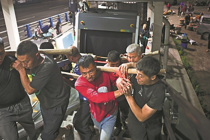 4月15日凌晨4时,工人在石船站搬运安检设备。为让菜农更加安全高效地进入车站,重庆地铁四号线公司专门为该站调配了一台大型落地安检机。
