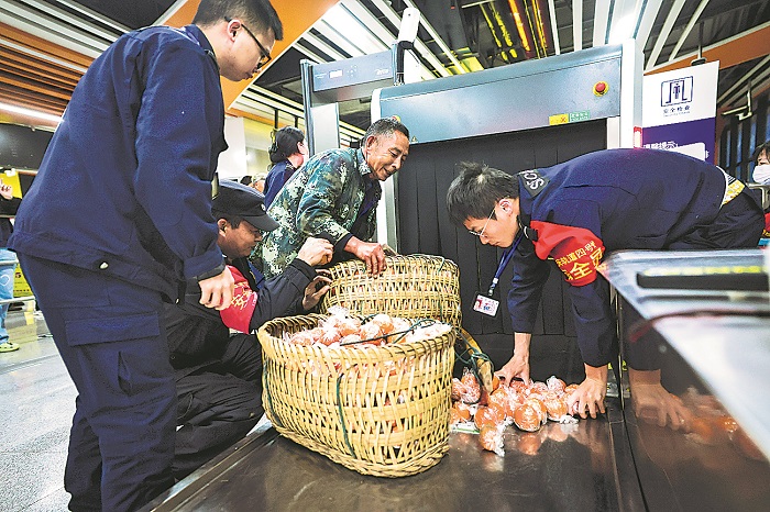 4月17日,重庆地铁4号线石船站,工作人员帮助菜农收拾散落在安检机上的橙子。