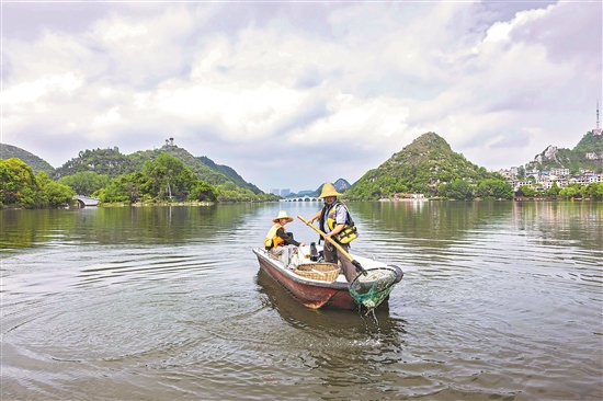 4月22日,环卫工人在贵州省安顺市西秀区虹山湖打捞湖面漂浮物。
