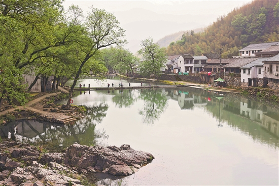4月13日,游客在浙江省余姚市鹿亭乡中村的晓鹿大溪上游玩。