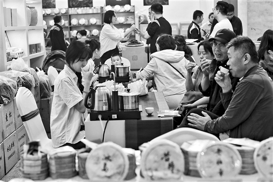 4月21日,在北京茶博会上,一名茶艺师(左一)和观众一起品茶。第十六届北京国际茶业及茶艺博览会于4月19日至22日在北京全国农业展览馆举办。本届茶博会汇聚700多家参展商,展出面积近2.4万平方米。