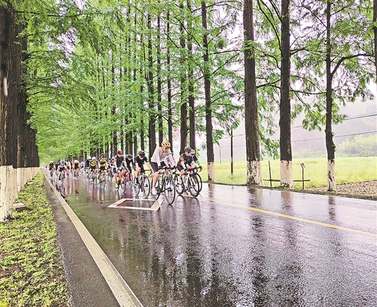 4月21日,钱江源公路自行车赛开化站开赛。作为此次骑行途经的桃下线是浙江开化县城通往多个乡镇的交通要道。该县于1980年在公路两旁种植水杉,经过40多年的精心养护,水杉郁郁葱葱,侧分的枝丫在空中盘绕形成一道拱门。人们穿行其间,就像进入了绿色世界。 徐曙光 余坚 摄