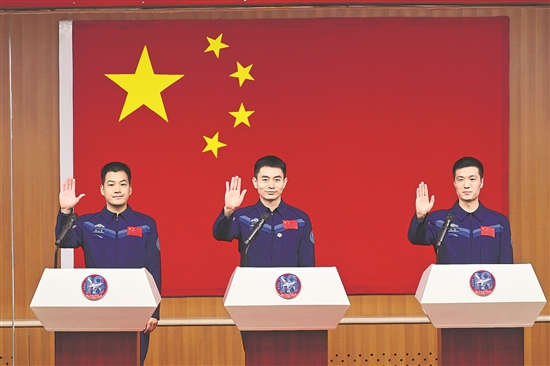 4月24日,神舟十八号载人飞行任务航天员叶光富(中)、李聪(右)、李广苏在酒泉卫星发射中心问天阁与媒体记者集体见面。