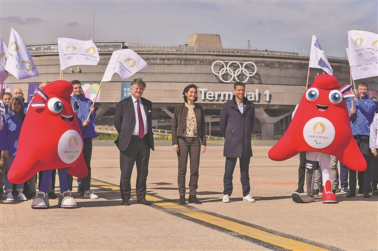 奥运五环标志亮相法国巴黎戴高乐机场