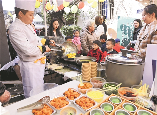 在浙江省湖州市小西街举办的新春市集上,“浙江工匠”蔡林荣(左)为人们制作当地特色小吃细沙羊尾。