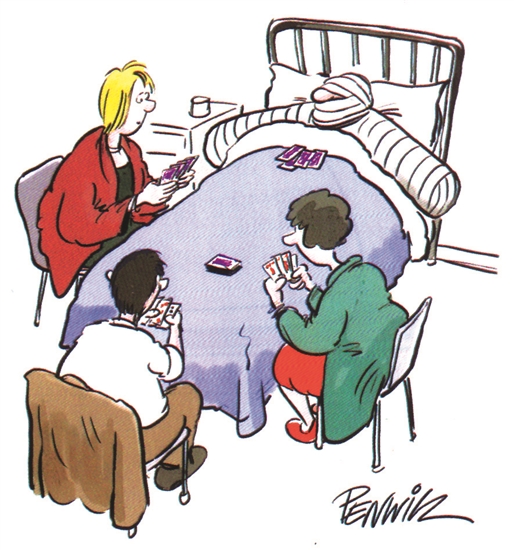 躺在病床上的这位老兄打牌是把好手且瘾头十足,身患沉疴仍不肯歇手,“一缺三”勉强凑齐牌局,在吆五喝六中赌出输赢。