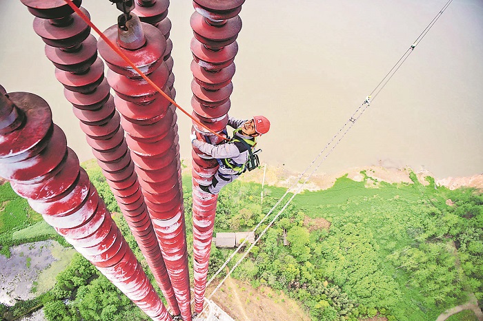 我曾经在111米的高空开展±1100千伏带电作业,也因此有幸成为世界上第一个进入±1100千伏电场的人。这次“走线”不同于之前的特高压带电作业,杆塔高度只有70多米,这个高度对我来说,轻松“拿捏”。