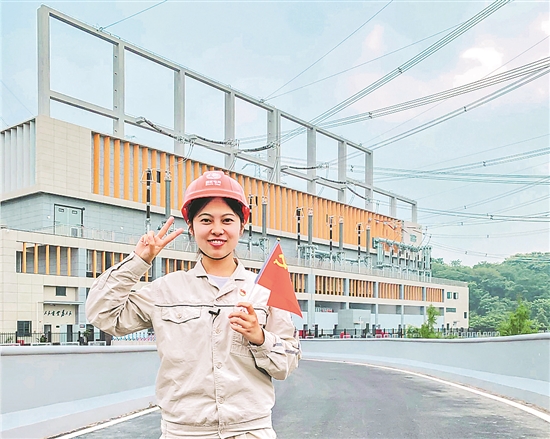徐颖雪与建成投运的500千伏金山变电站合影。