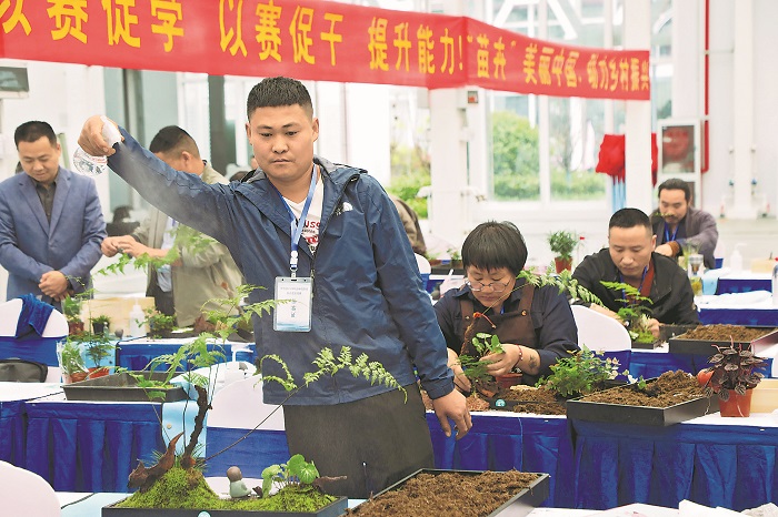 4月30日,在安徽省合肥市肥西县“把春天装进花盆里”主题园林微景观制作技能竞赛现场,选手们在制作园林微景观。