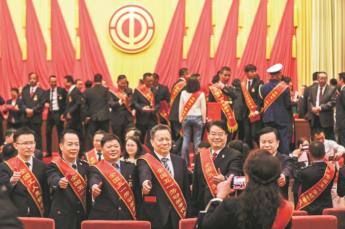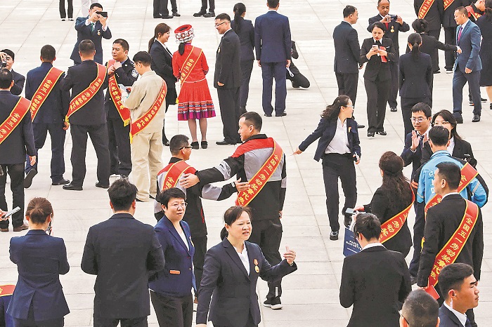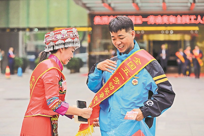 中国职工之家门口,今年的全国五一劳动奖章获得者粟琼(图左)帮助另一位获奖者洪成木整理绶带。