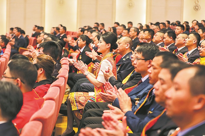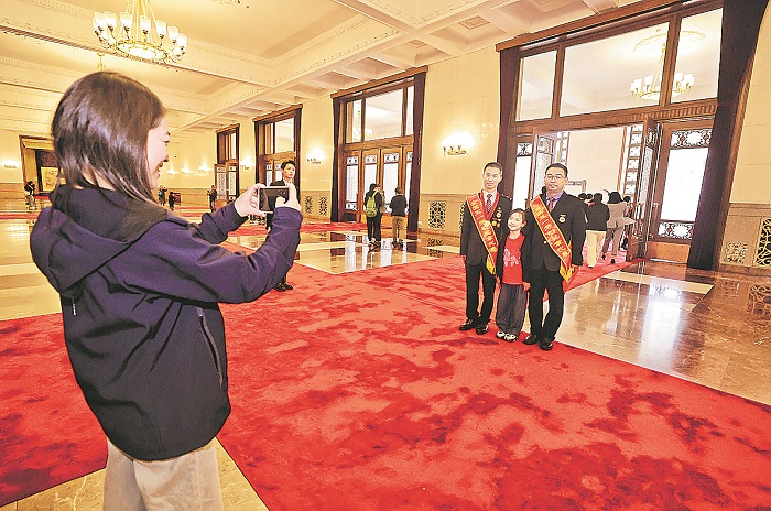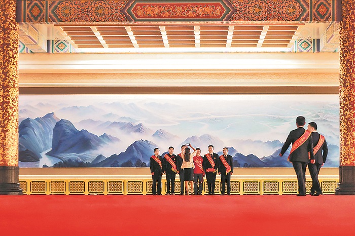 表彰大会开始前,获奖代表们在北京人民大会堂里的《长江万里图》前合影。