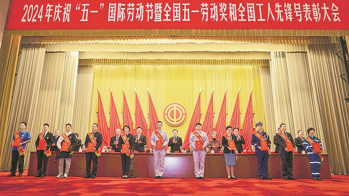 4月28日,2024年庆祝“五一”国际劳动节暨全国五一劳动奖和全国工人先锋号表彰大会在北京人民大会堂举行。表彰大会结束后,获奖代表在现场拍照留念。