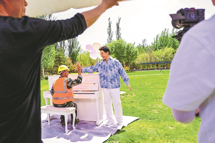4月18日,央视总台在中关村软件园内的一处草坪上录制2024年“中国梦·劳动美”庆祝“五一”国际劳动节心连心特别节目,来自深圳的建筑工人易群林应邀与知名歌手任贤齐搭档演出。