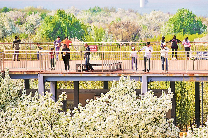 近日,河北省张家口市怀来县小南辛堡镇大古城村印象海棠公园中,游人正在园中赏花游玩。据了解,小南辛堡镇是目前全国规模最大的八棱海棠栽培基地,面积和产量均居全国首位。近年来,当地抢抓京津冀协同发展和京张体育文化旅游带建设机遇,打造出京张体育文化旅游带上的新名片。通过发挥“文化+旅游+节庆”的作用,持续举办海棠花节,以花为媒,赋能乡村振兴。本报记者 王伟伟 摄