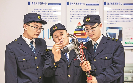 图为该段技能大师周文刚(中)与小组青年职工试验自制的动车组高压电故障应急工装设备。 刘路 张晋彤 摄