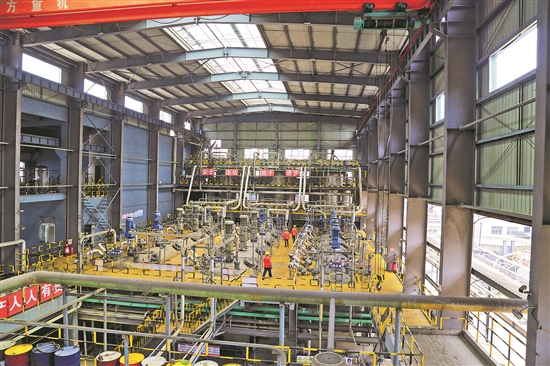 图为氧压工段一班工人在氧压浸出生产车间巡检。
