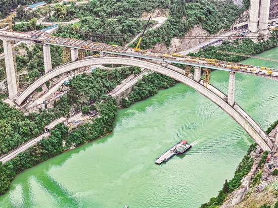 这是5月6日拍摄的建设中的渝湘高铁黄草乌江双线大桥(无人机照片)。 近日,由中铁大桥局承建的渝湘高铁重庆至黔江段黄草乌江双线大桥顺利实现合龙,进入桥面系及附属工程施工阶段。随着黄草乌江双线大桥的合龙,由中铁大桥局承建的渝湘高铁重庆至黔江段三座横跨乌江的铁路桥,已全部完成主体结构施工。