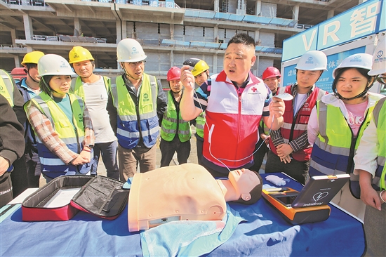 5月8日,江苏省徐州市鼓楼区一建筑工地,急救培训教员向工人讲解自动体外除擅仪使用方法。