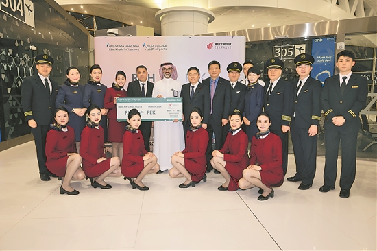 近日,国航北京至利雅得直飞首航航班的机组成员和来宾在沙特阿拉伯利雅得哈立德国王机场合影。