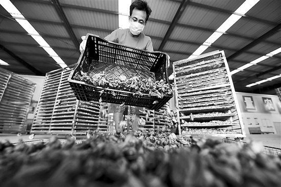 5月9日,在河北省衡水市阜城县张家庄村玫瑰种植基地,花农在初筛玫瑰花蕾。