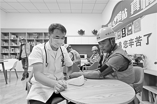 5月9日,医务人员在雄安新区大河片区一处暖心驿站内为建设者测量血压。